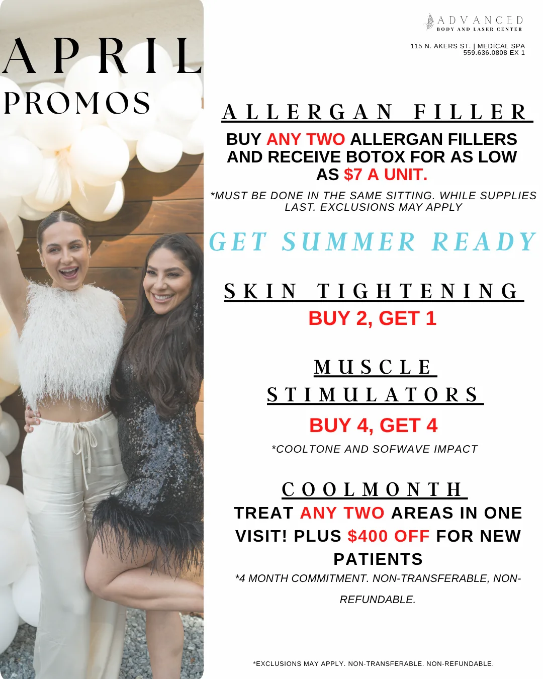 Advanced Body and Laser Center is offering April promotions designed to help you save on a range of treatments this month. Allergan Fillers are included with a special offer: purchase any two fillers and receive Botox as low as $7 per unit. Additional offerings include skin tightening treatments, muscle stimulators, CoolSculpting memberships, and our CoolMonth special—treat any two areas in one visit and receive $400 off for new patients. Contact us to learn more or to schedule your appointment. (exclusions may apply; non-transferable/non-refundable).