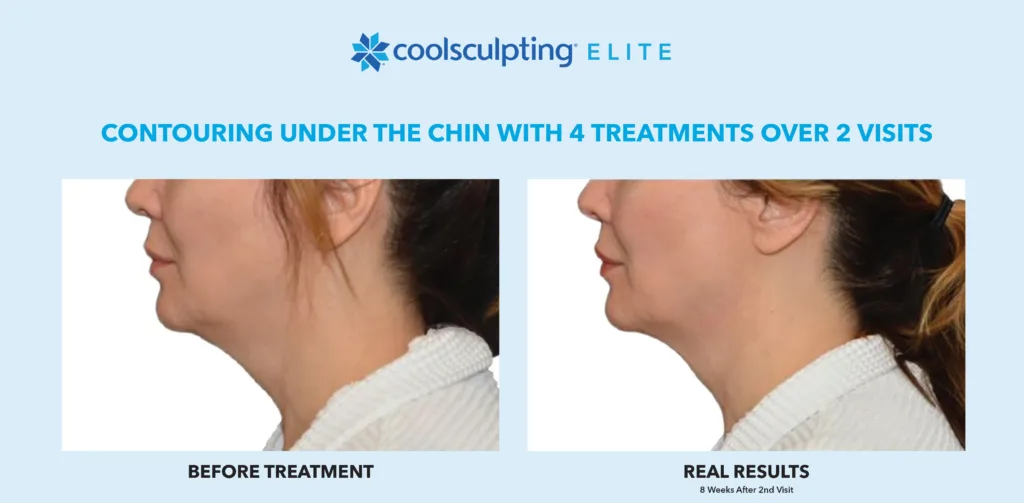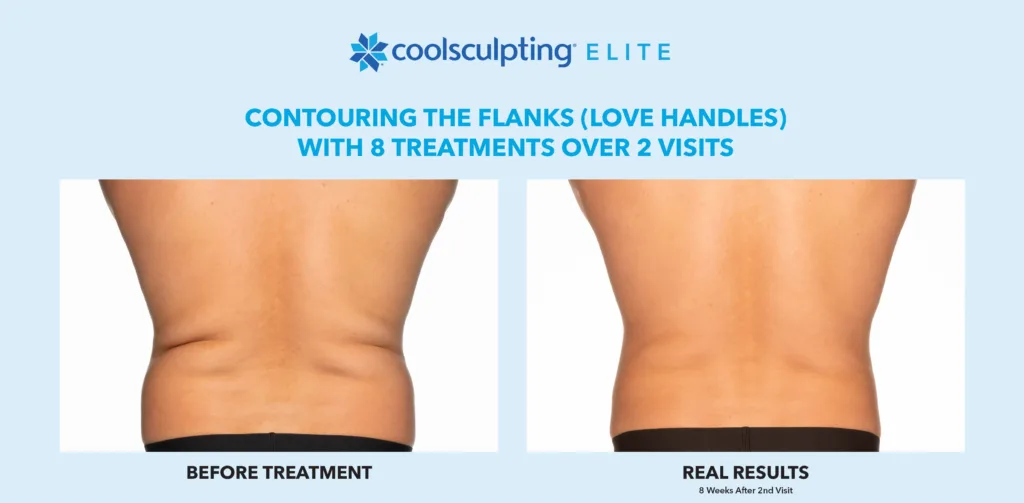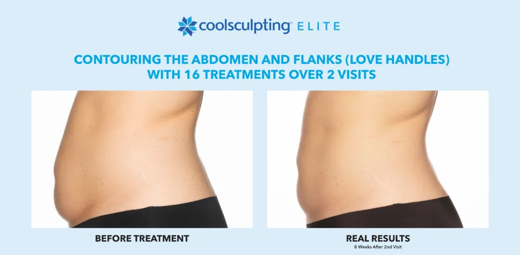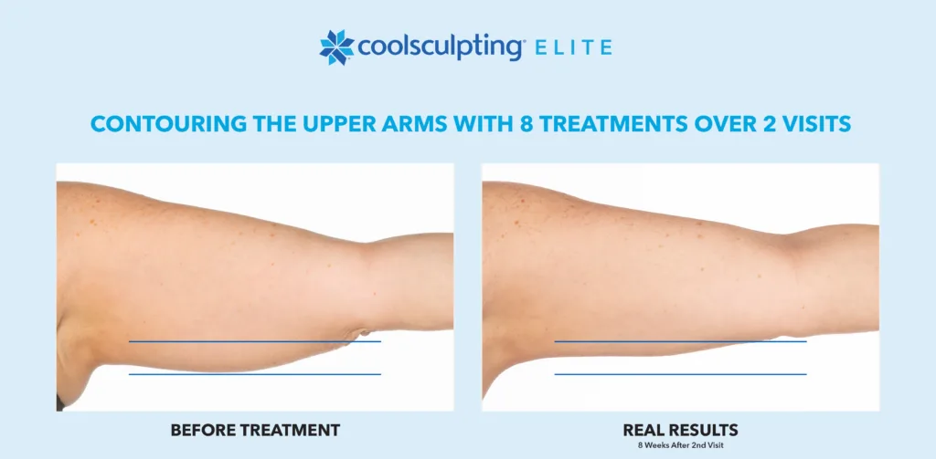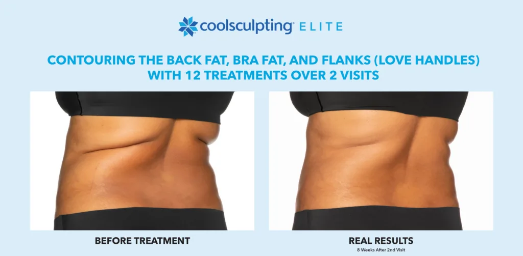 CoolSculpting Elite is FDA-cleared to treat nine areas of the body, including the abdomen, thighs, flanks, upper arms, bra fat, back, chin, jawline, and banana roll. It’s a versatile option for reducing fat in both large and small areas.